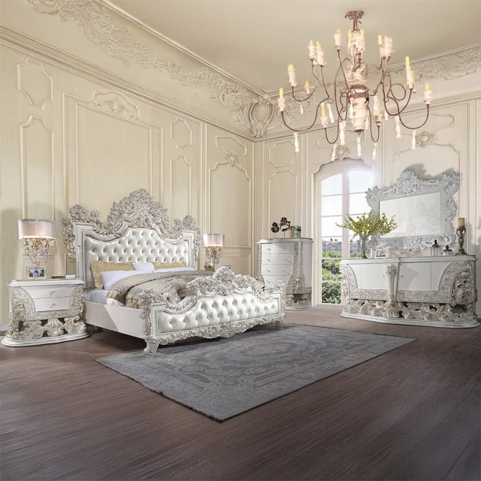 Bringing a modern approach to the classic ornate Rococo style, the Adara bed blends in contemporary touches with traditional design details. The PU adds a fresh approach to the intricately embellished bed. The antique white is embellished with light gold hand brushed details to make the floral motifs pop. This is one statement piece that will impress everyone.