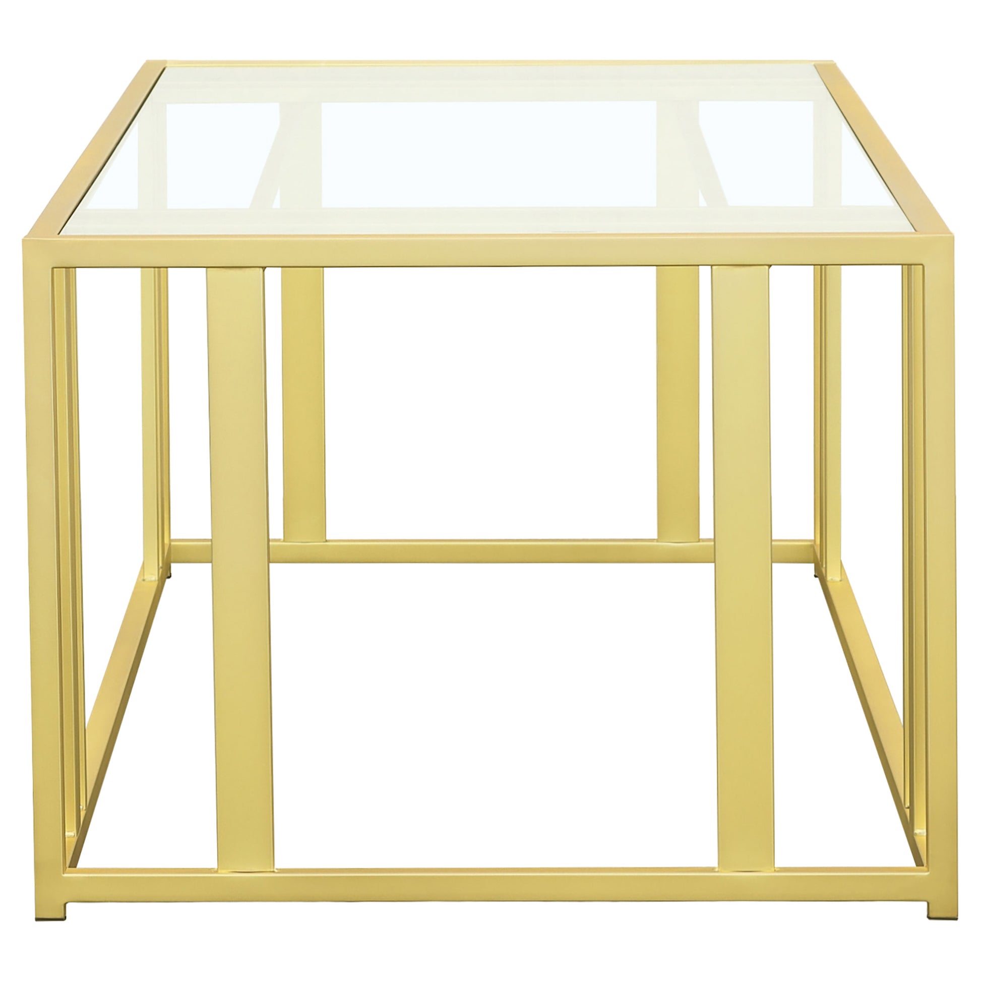 This modern rectangular coffee table features a clear tempered glass top paired with a geometric base made from heavy-gauge metal with a sleek electroplated finish. The open design offers a contemporary aesthetic, blending elegance with durability. Perfect for displaying decor or organizing essentials, its scratch-resistant materials ensure lasting quality. The compact design makes it an ideal addition to any living room, lounge, or small space.