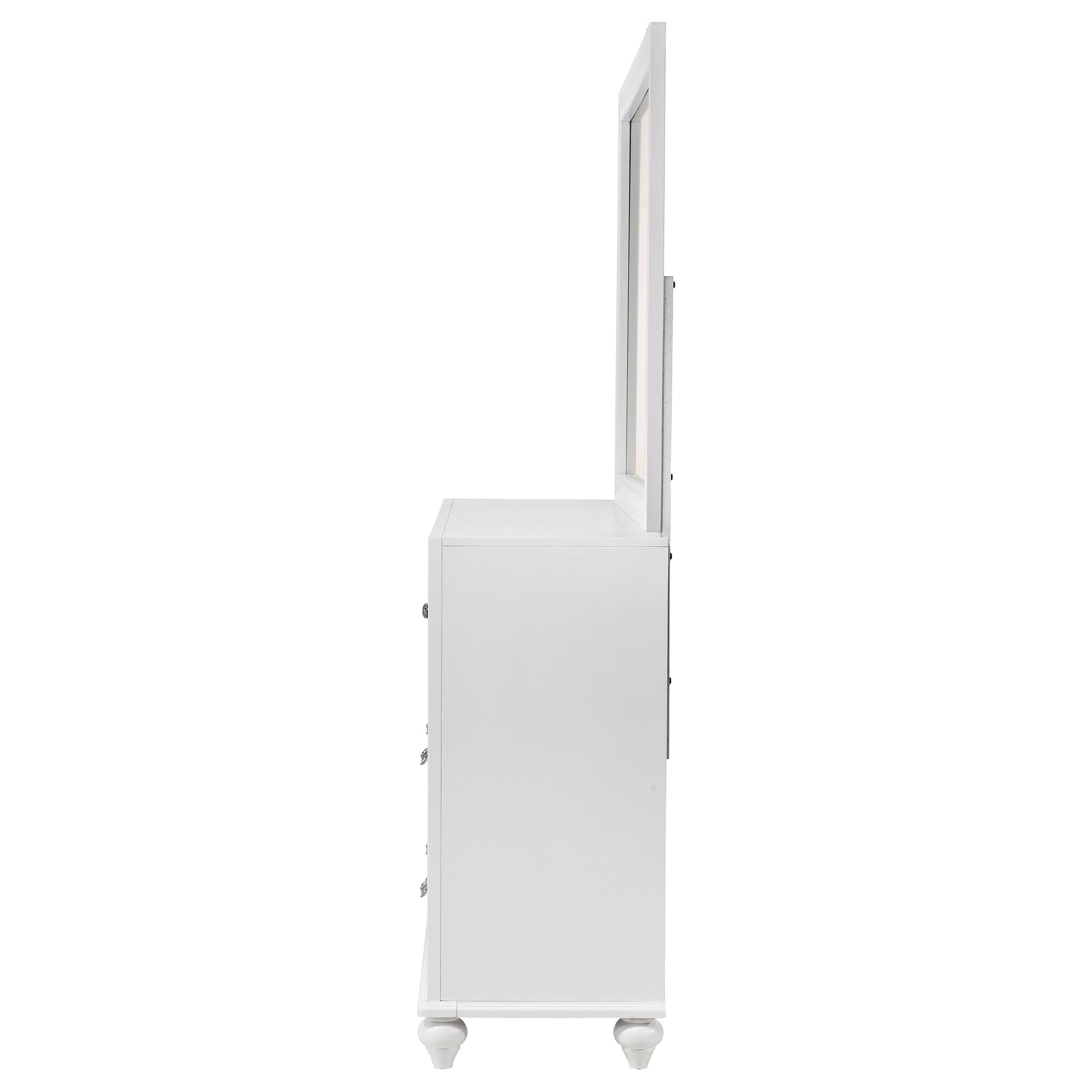 Elevate your bedroom with the glamorous appeal of this dresser and mirror set. The seven-drawer dresser showcases sparkling acrylic panels on its top drawers, complemented by faceted crystal hardware for radiant elegance. A crisp white finish highlights its clean silhouette, while turned bun feet add a timeless touch. The coordinating mirror features a beveled wooden frame that reflects light beautifully, enhancing the dresser’s bold style. Built with solid rubberwood, engineered wood, and okume veneer, this set balances chic design with lasting durability.