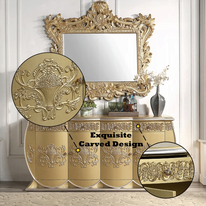 The'Bernadette Collection'pieces were inspired by the extravagantly decorated Rococo period in 18th century France. With its extensive decorative moldings and carvings, this furniture collection is sumptuous and extreme in design features. Utilizing many different types of material and ornamentation in a single piece to accentuate its richness and decor style.