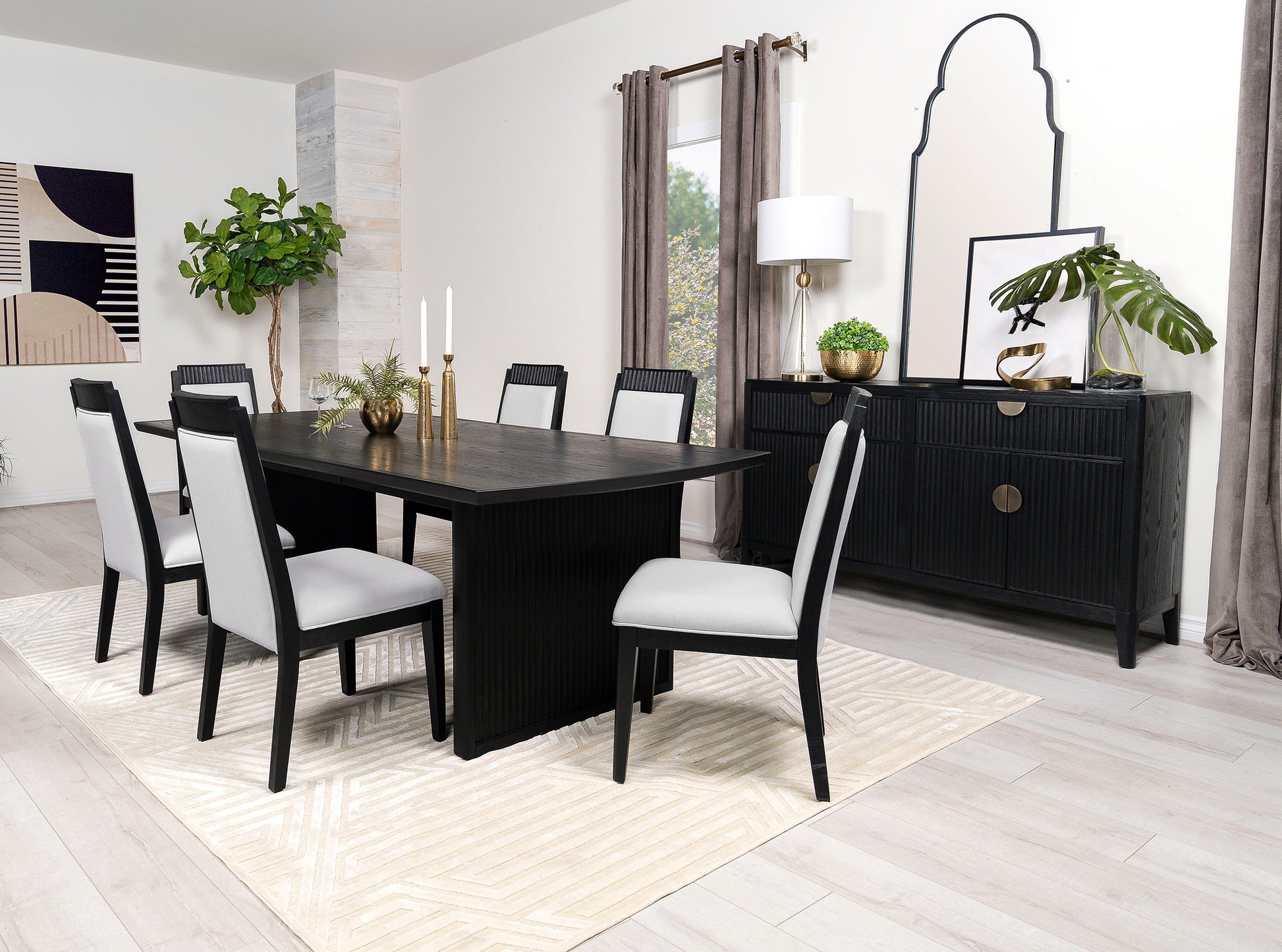 Captivating with a touch of Art Deco style, this black wood sideboard is a functional and fashionable addition to your dining room or living space. A great choice for expanding dining room storage, this chic sideboard is built of rubberwoods and wood products, sturdy and solid. A dramatic black finish embellishes linear groove designs on its door fronts and drawer fronts, adding a textural element to impart dimensionality. Find space for your serve ware and implements in a pair of top drawers and in shelving behind four doors. Drawers feature English dovetail construction on metal extension glides, and ornate metal hardware completes an artisanal look.