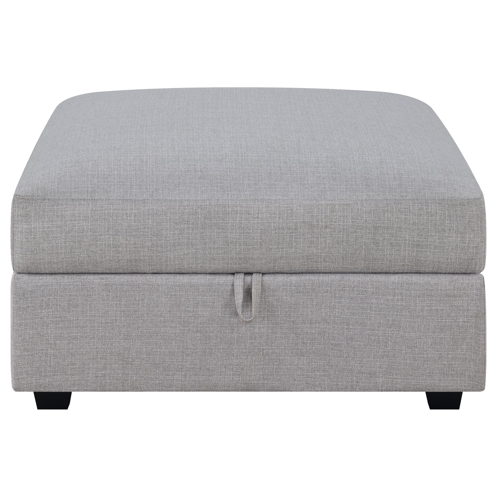 This storage ottoman combines sleek modern design with functional versatility for the living room. Upholstered in soft grey fabric, it features clean lines and a spacious hidden compartment for storing blankets, pillows, or daily essentials. Designed to pair seamlessly with modular sectional components or stand alone as a plush footrest, it offers exceptional flexibility. Feather-down wrapped cushioning and solid wood legs provide lasting comfort and support, blending practicality with refined contemporary style.
