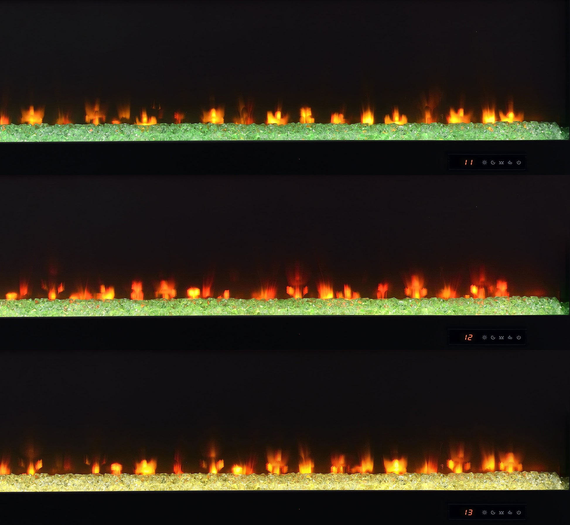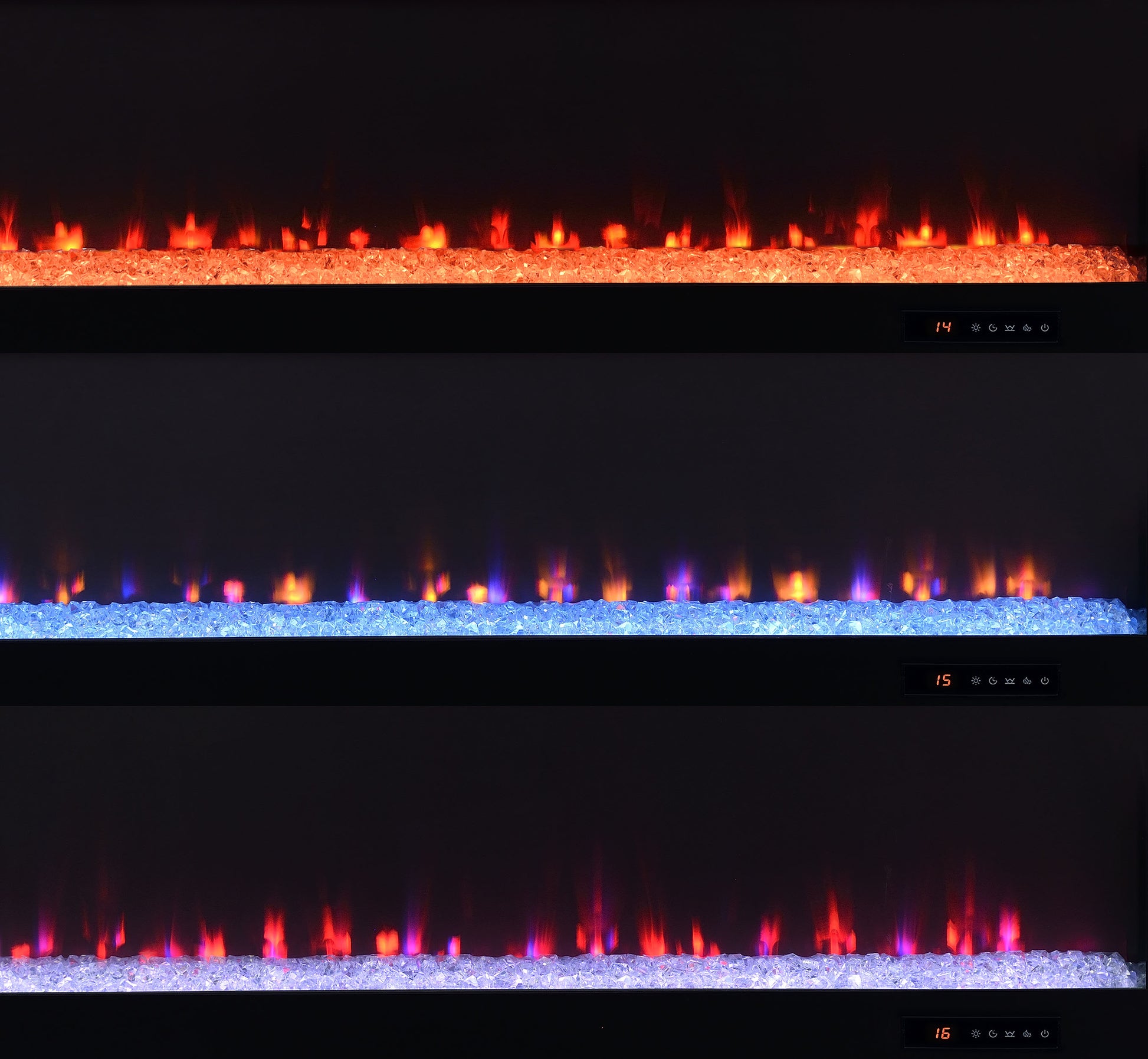 • TV stand fireplace console with flame visualizer and crushed acrylic crystals for visual warmth