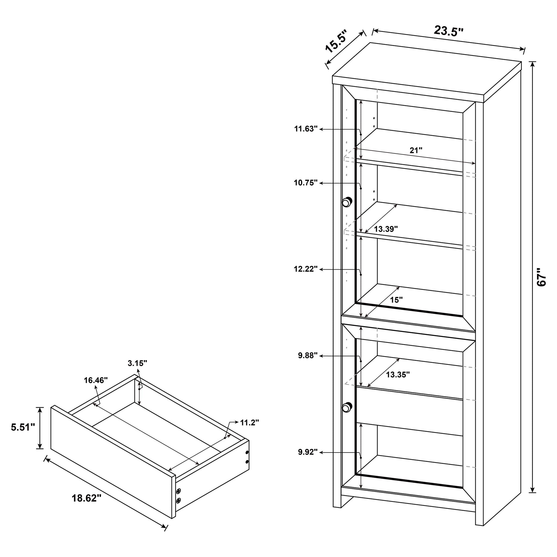 Elevate your space with a media tower that blends quiet elegance and thoughtful design. Wrapped in a bold black finish, this two-door cabinet reveals a rich interior contrast and graceful utility. Framed glass doors showcase your favorite pieces above, while a hidden drawer below offers a secret haven for everyday essentials. Whether you're curating a display or storing away the everyday, this tall, slender silhouette adds a refined presence to any corner it inhabits.