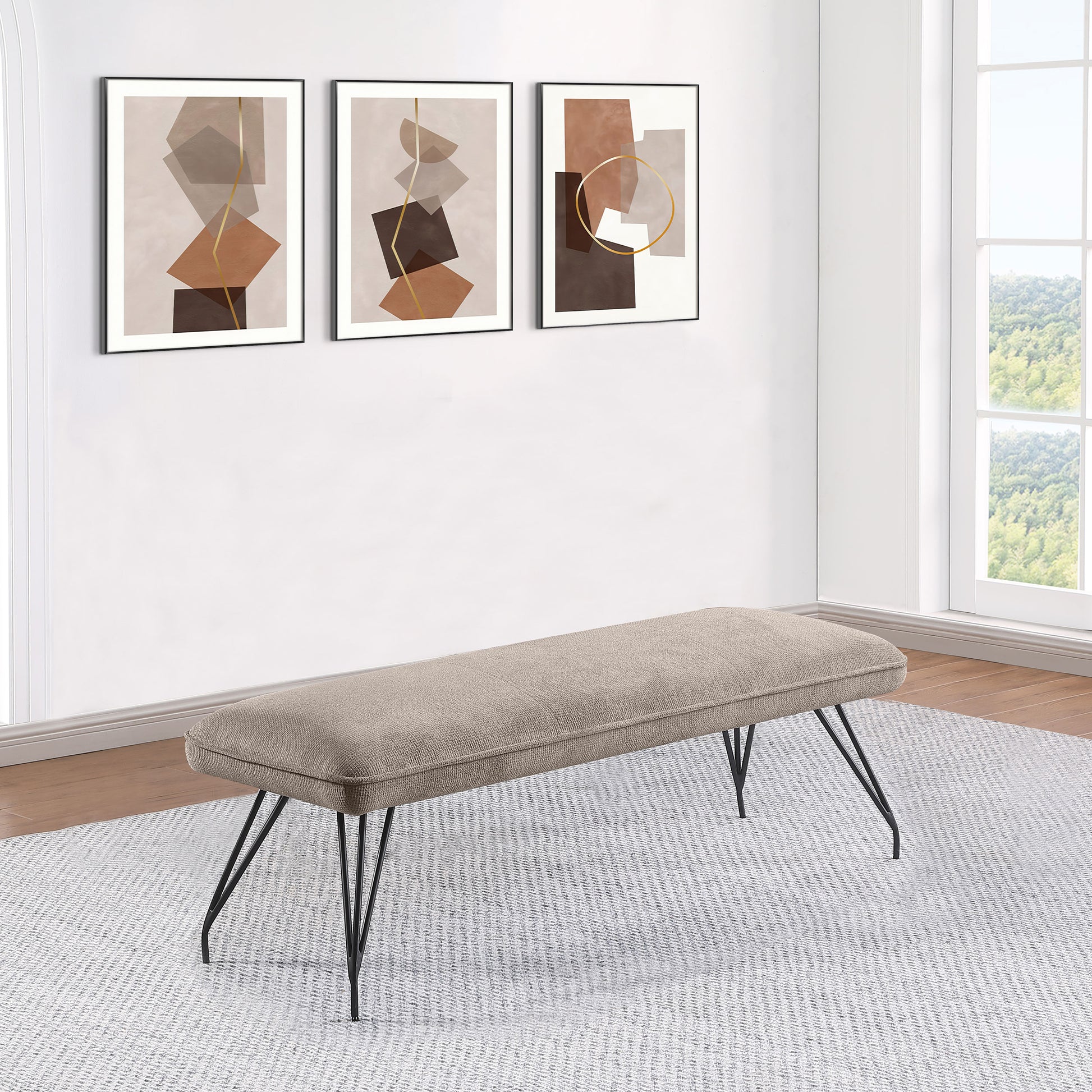 Put the finishing touches on your kitchen or dining room table with this mid-century inspired modern dining bench. Offering vintage appeal, it features splayed, hairpin style legs that bring both lightness and familiarity. The long, backless bench seat is constructed with metal, fabric (100% polyester), rubberwood, foam, plywood, and webbing, providing additional dining seating. The seat features pocket coil sinuous springs and webbing for cushion support, ensuring excellent comfort. The neutral upholstery is complemented by piped trim, adding a fresh, tailored touch to the overall look, while a black finish graces the legs of the bench for a smooth, seamless look at your dining table.