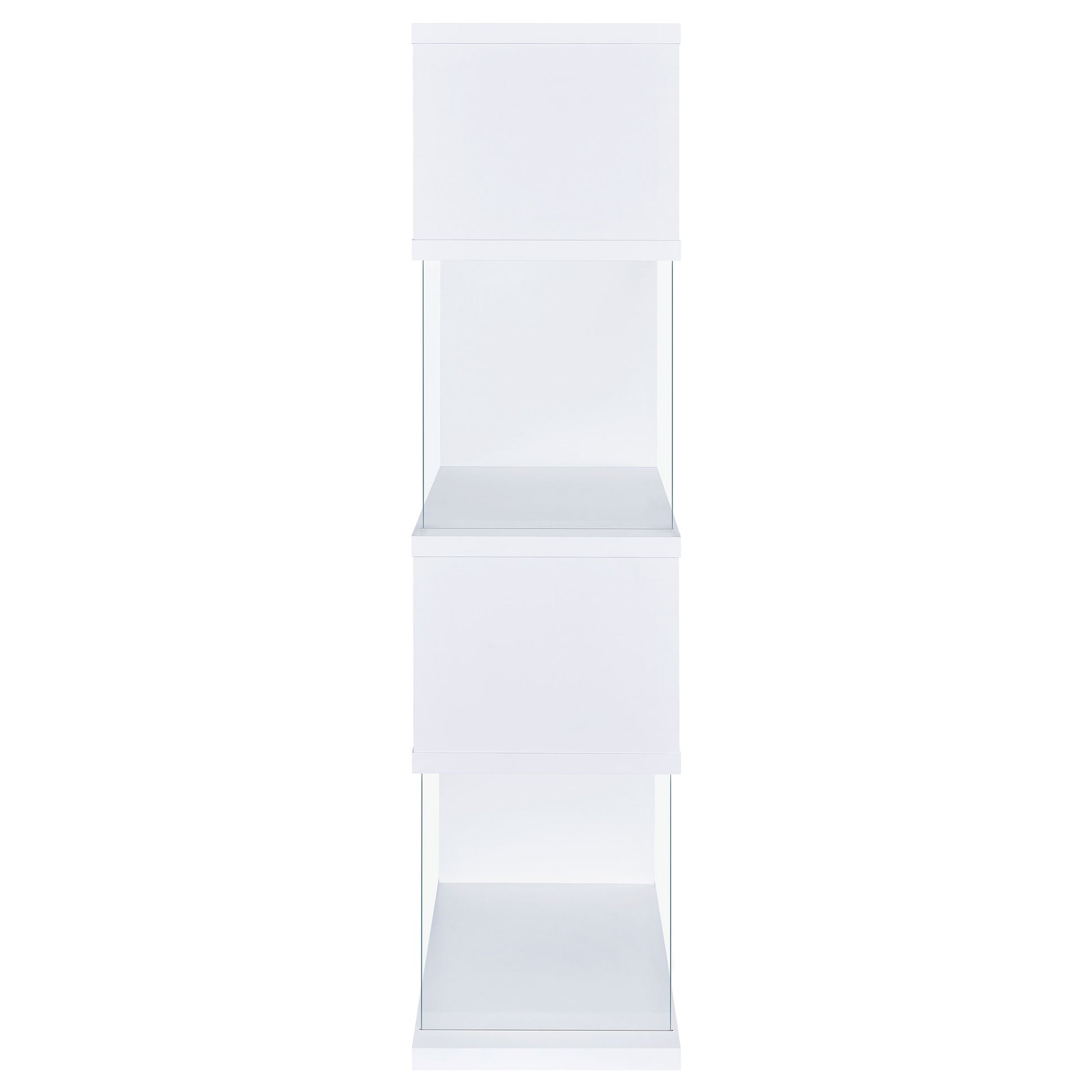 Creatively crafted, this bookcase enhances the modern aesthetic of any home. Its shelves are arranged in an eye-catching, zig-zag design, adding contemporary charm. Its silhouette is accentuated by clear tempered glass panels to complete its chic, trendy look. Expert craftsmanship and top quality materials lend strength and durability. It's available in four finishes, giving you attractive options to match your home decor.
