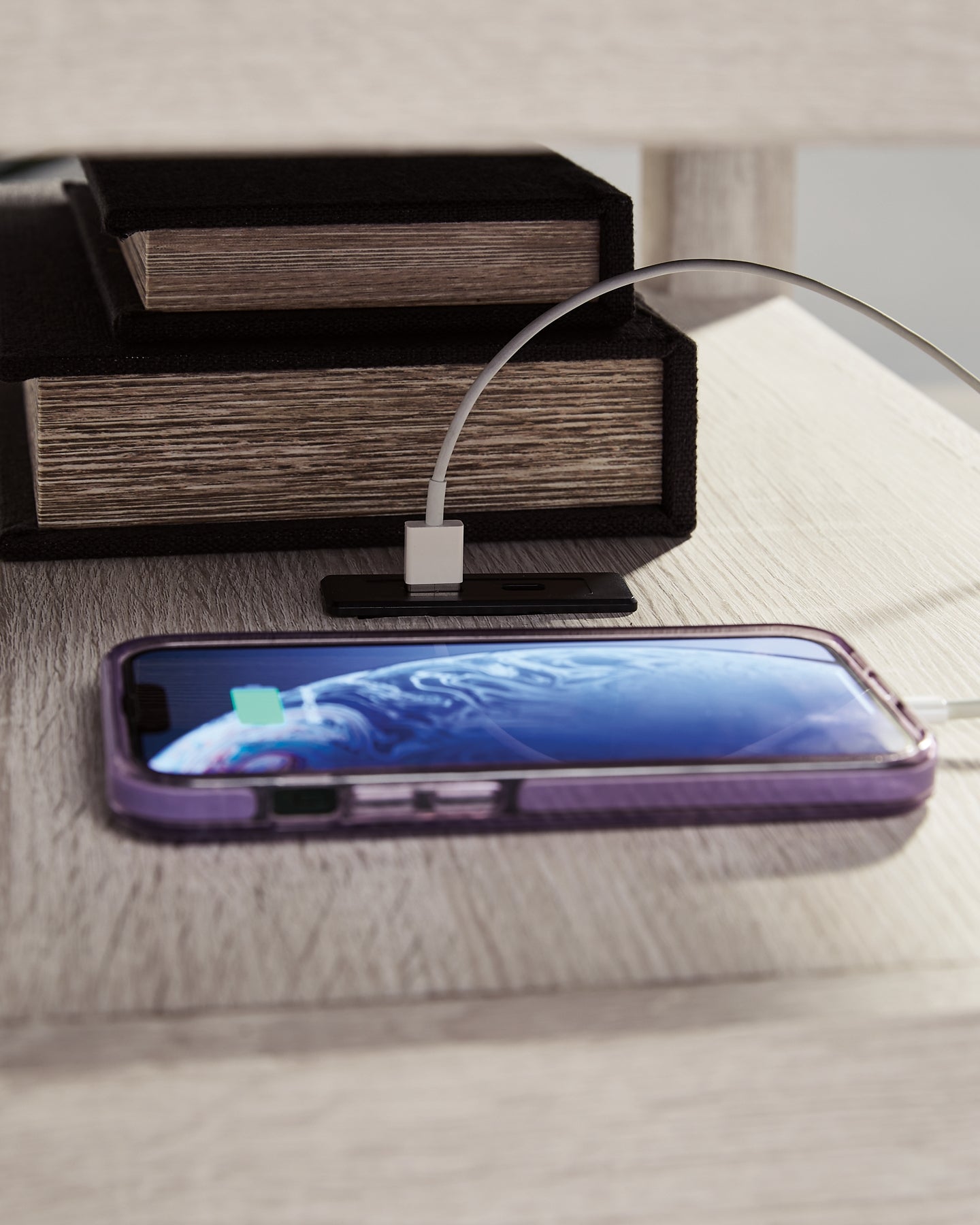Embrace simply stylish sofa-side function with this chairside end table. Keep entertainment essentials like remotes, coasters and more close with the handy storage cabinet. Battery running low? Built-in USB ports keep easy charging at your fingertips. And with the table's two-tone look in gray and antiqued white, it has the versatility to pair with aesthetics from casual to farmhouse.