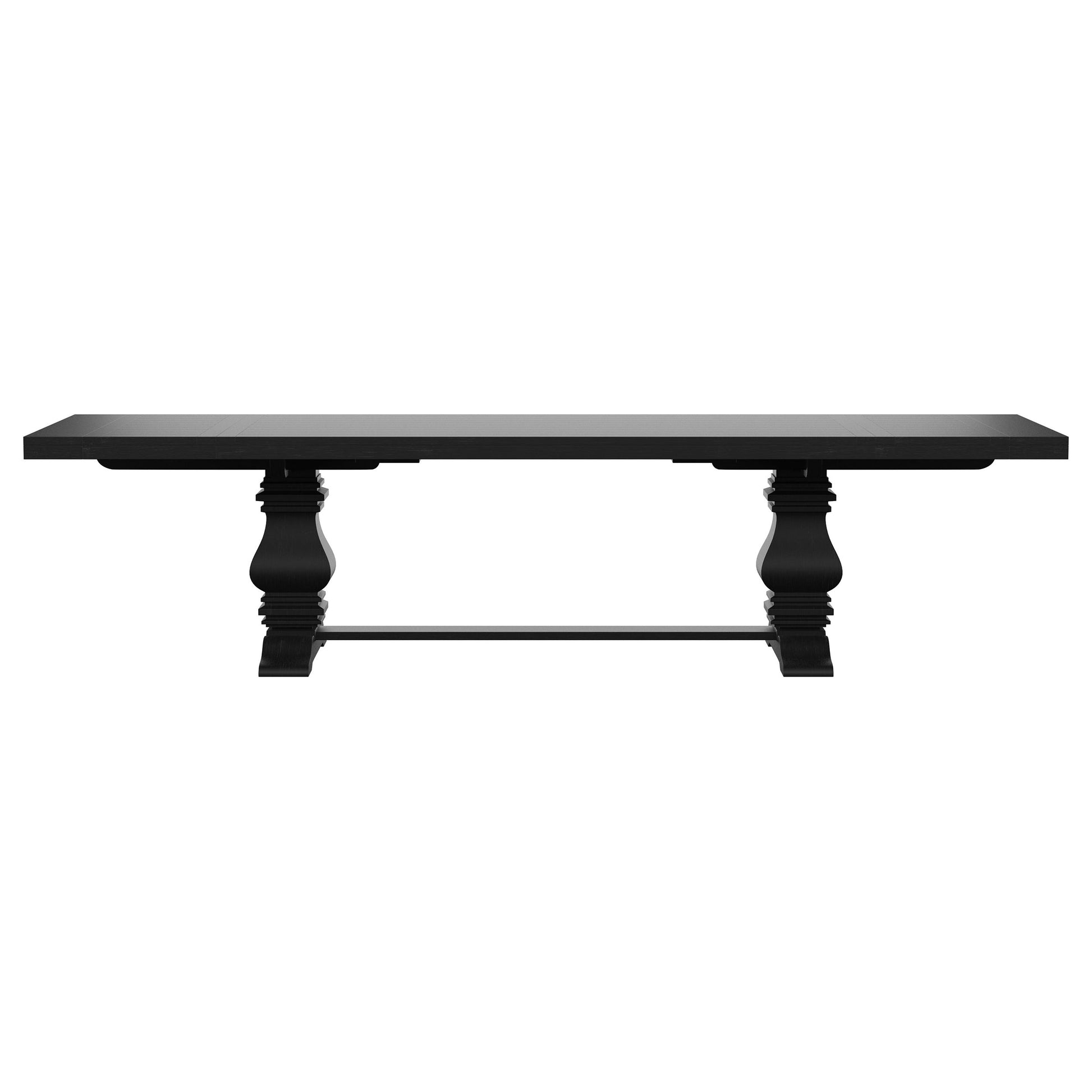 This rectangular extension dining table blends classic European elegance with artisan craftsmanship. Crafted from solid pine, it features a double pedestal trestle base that exudes romantic charm and timeless character. The sculpted pedestals, connected by a wide plank accent, create a striking focal point with an authentic handcrafted feel. A planked tabletop enhances its rustic appeal, while two 16-inch removable leaves extend the table up to 126 inches, making it perfect for gatherings large and small. Built for both beauty and durability, this table is an inviting centerpiece for any dining space.