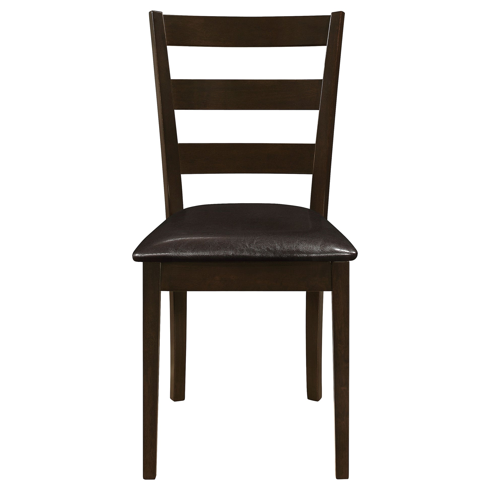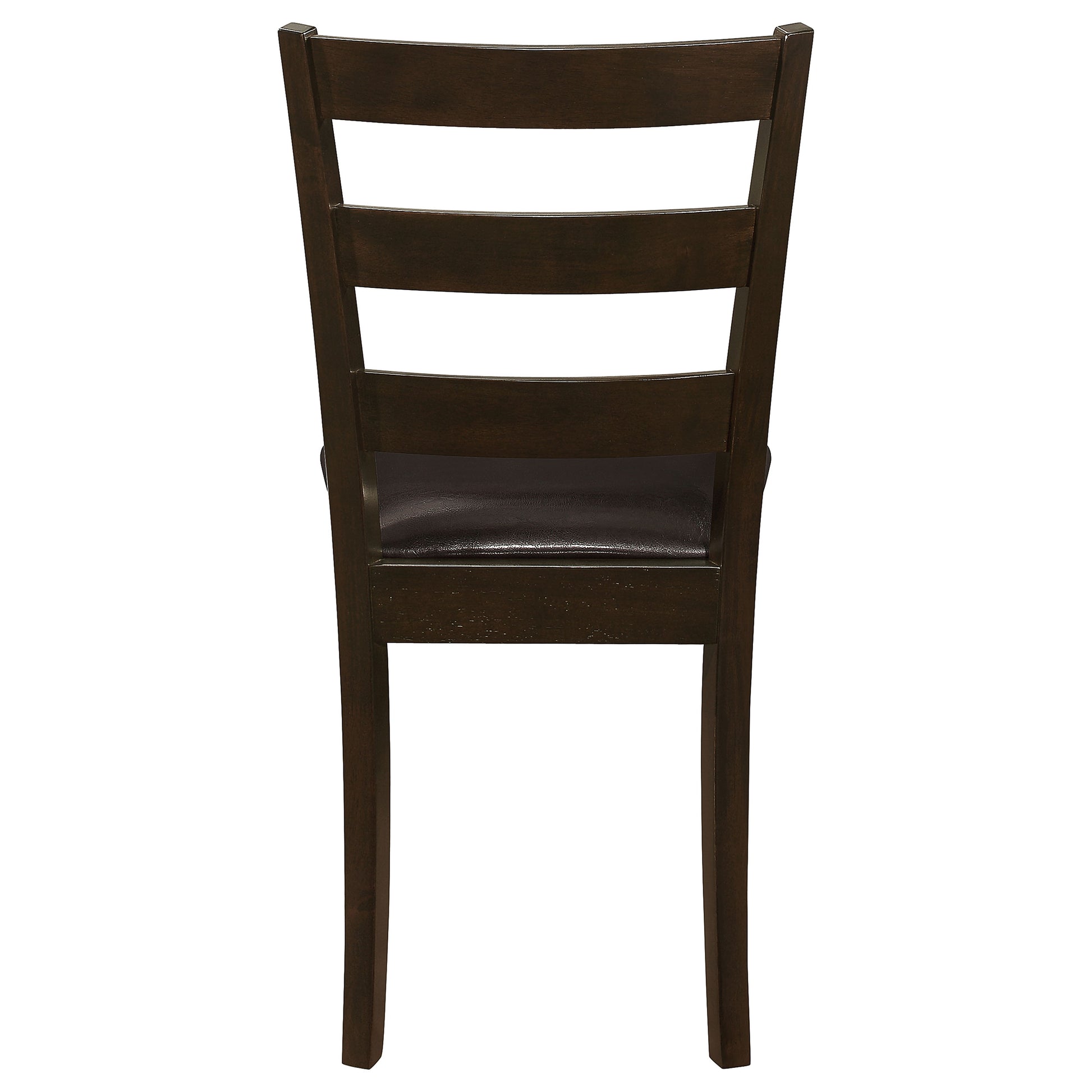 • Ladder-back chairs include padded seats in dark brown leatherette upholstery