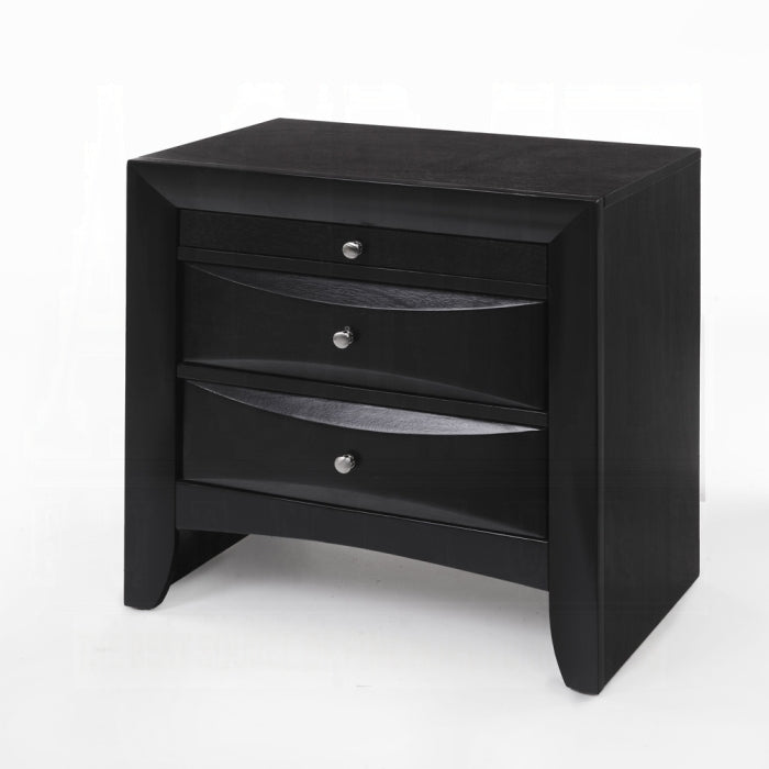 The Ireland nightstand features two spacious storage drawers and one pull-out tray. With English dovetail with center metal glides. The tray will keep essentials close by and pull out tray offers you additional surface area. Complemented by slightly flared square legs, the collection features contemporary feel and . A modern black finish with shaped drawer fronts.