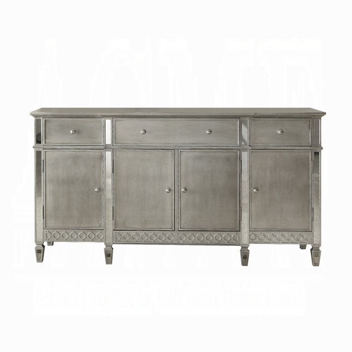 Crafted with past and present in mind, our Kacela dining collection revitalizes and transforms traditional designing ideas. A grand centerpiece, the rectangular table is handsomely finished and enriched by tapered legs and mirror insert top and edges. Paired with button tufted backrest side chairs with nailhead trim and matching server makes the whole set becoming an eye-catching one. This will be the best collection for your dining room.