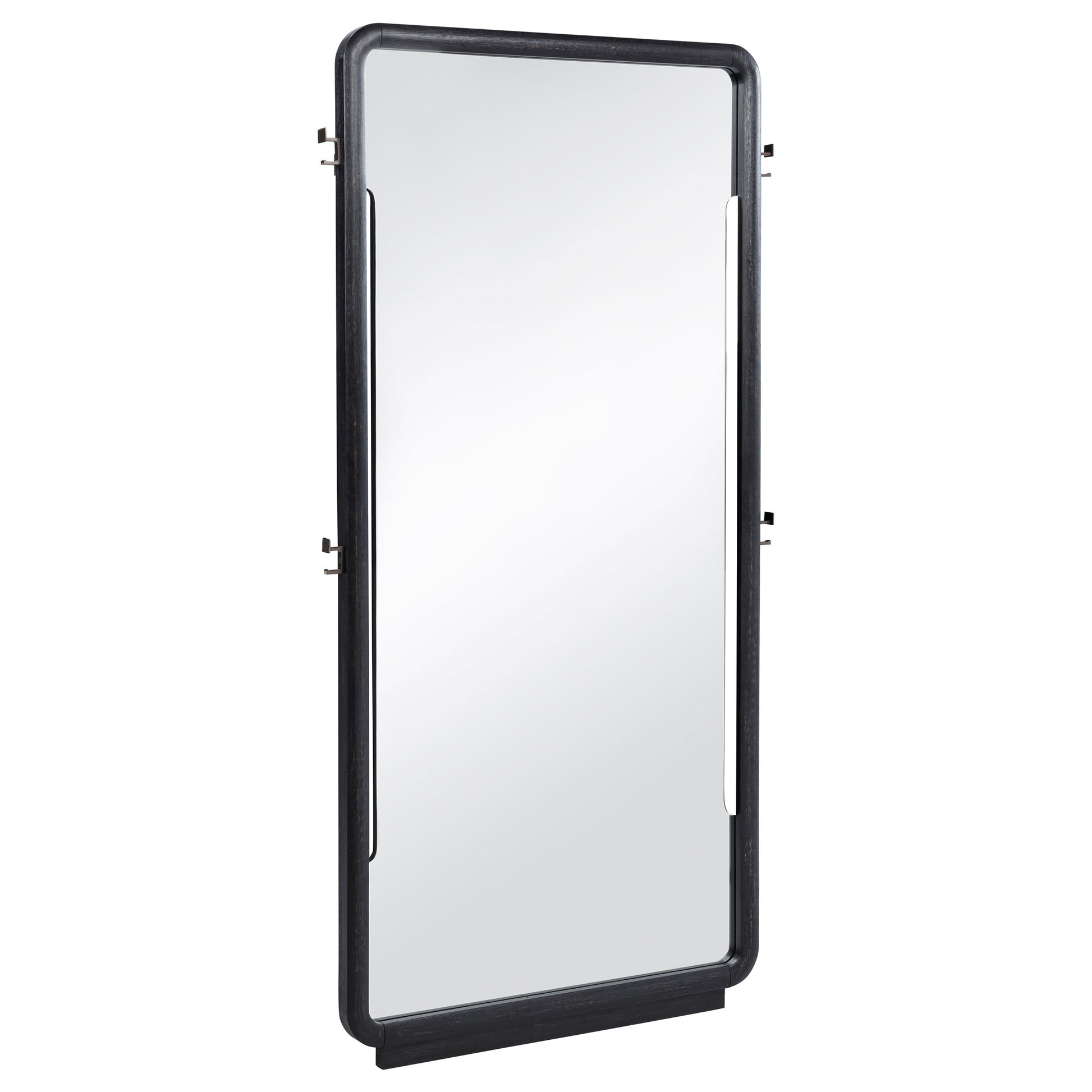 Bold in scale and softly contoured, this full-length floor mirror brings sculptural presence to any room. Framed in a deep burnished black finish with rounded corners, it offers a tall, uninterrupted reflection perfect for everyday use. Designed to lean securely against the wall, it also features integrated side hooks ideal for hanging garments, accessories, or daily essentials with subtle utility and style.