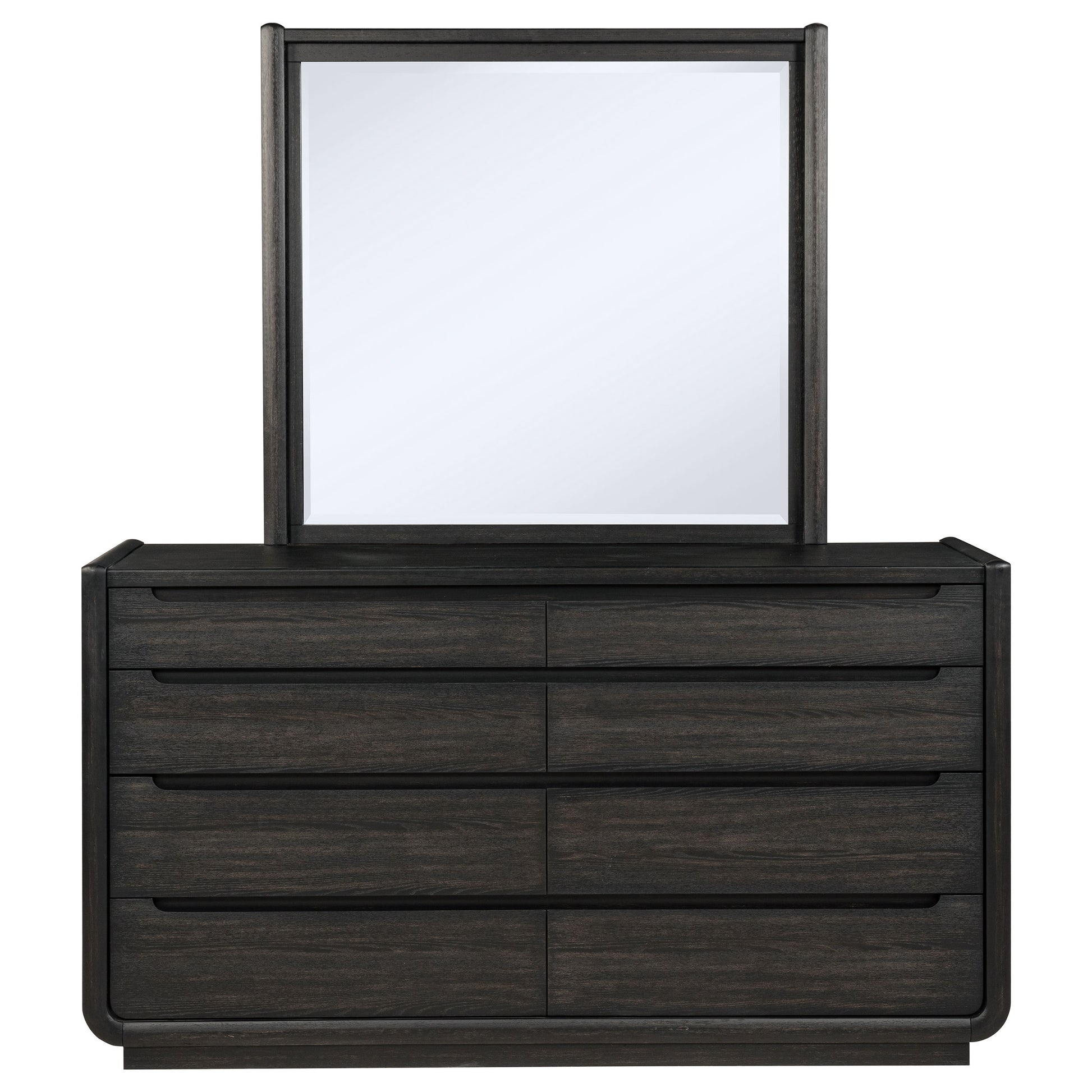 Grounded in grace and softened by design, this eight-drawer dresser and mirror set brings balance to the bedroom with understated elegance. Cloaked in a burnished black finish, the frame curves subtly at the edges for a sculptural feel. Spacious drawers open with quiet ease thanks to soft-closing glides, while black felt lining in the top drawers offers protection for delicate essentials. Above, a minimalist mirror completes the silhouette, reflecting form and light in quiet harmony.