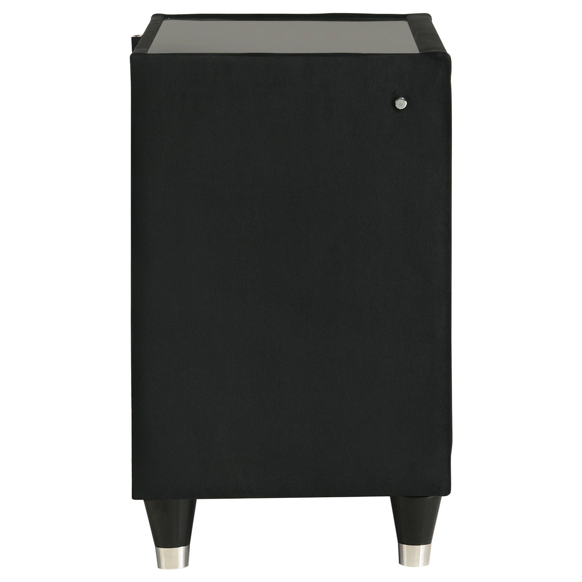• Two-drawer nightstand fully upholstered in a black velvet for luxe layering