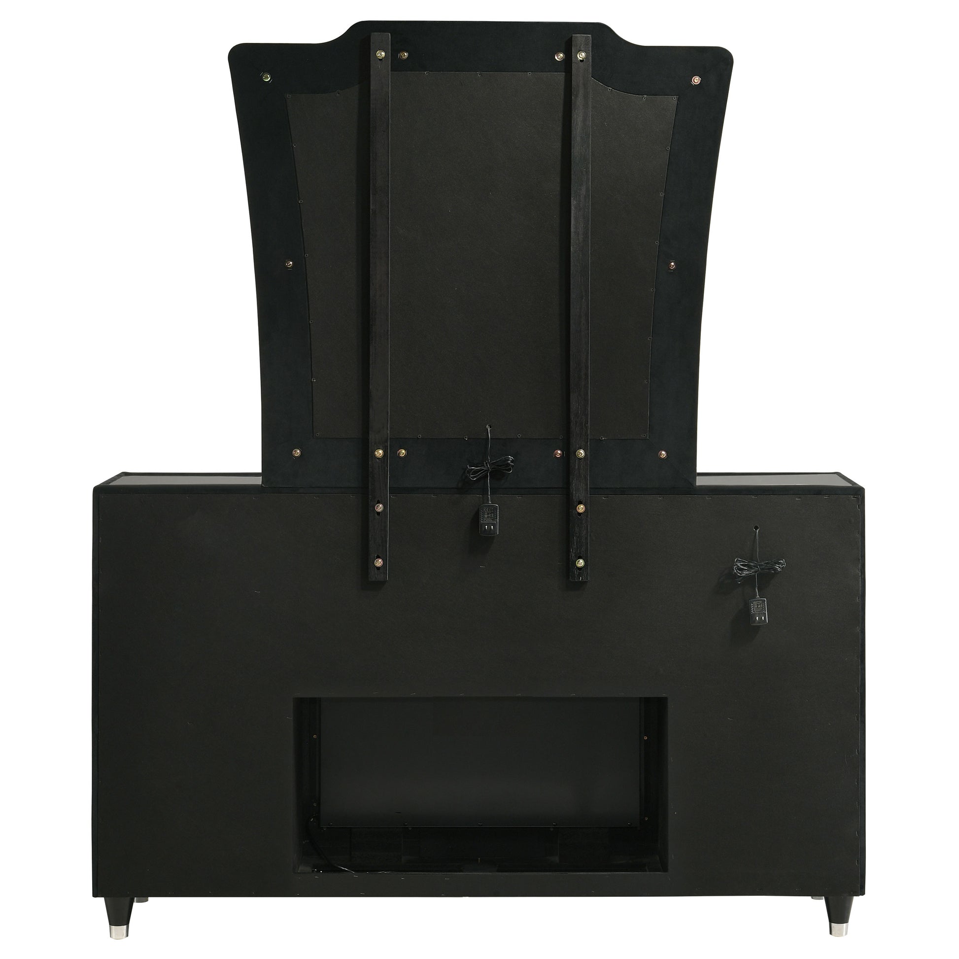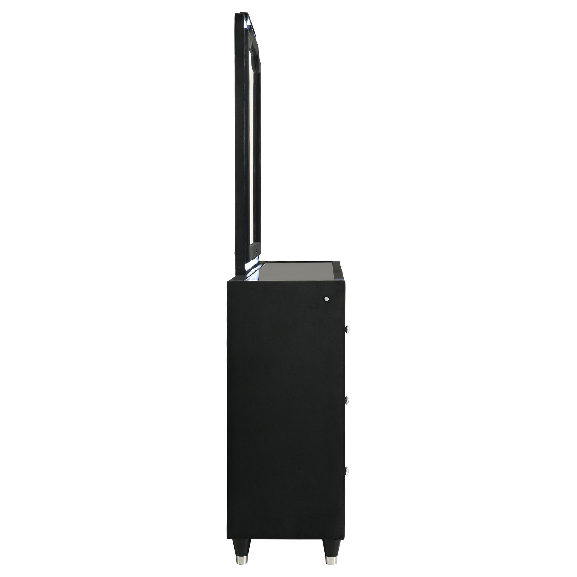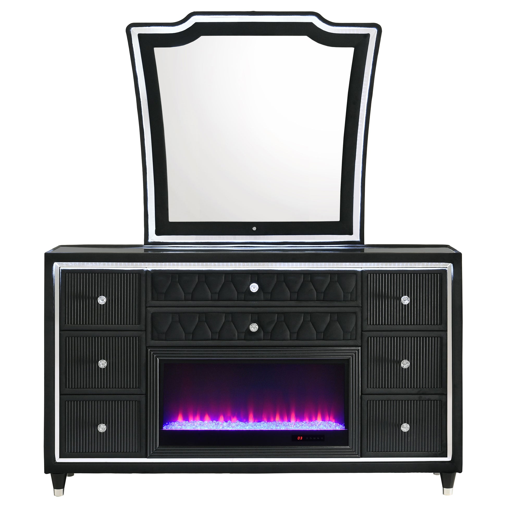Warmth meets radiance in this dresser and mirror set, where black velvet surround every surface. A built-in flame visualizer sits beneath a clear tempered glass top, with LED case lighting adding atmosphere. The tri-panel mirror features LED illumination to complete the glow. Finished with crystal knobs, quilted velvet fronts, and felt-lined drawers, this set pairs soft elegance with practical brilliance, all lifted by solid rubberwood legs.