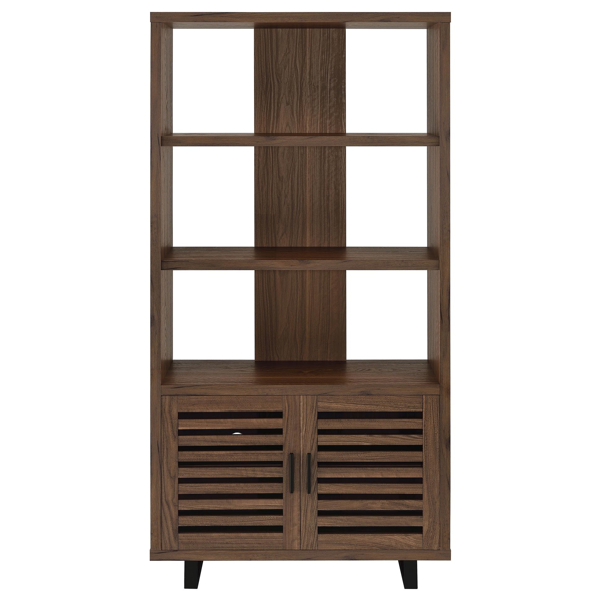 Create storage and add charm in one with a modern bookcase. It features a cabinet in the base, decorated with slatted doors that open to reveal shelving for easy storage. Upper shelves are open, with a center slat that creates dimension and offers structured support. The bookcase features a warm, rich walnut wood finish, easily lending in modern and mid-century inspired living spaces, bedrooms, and dens. The bookcase features a melamine finish that's durable and resistant to scratches and a tip-over restraint is included for added safety.