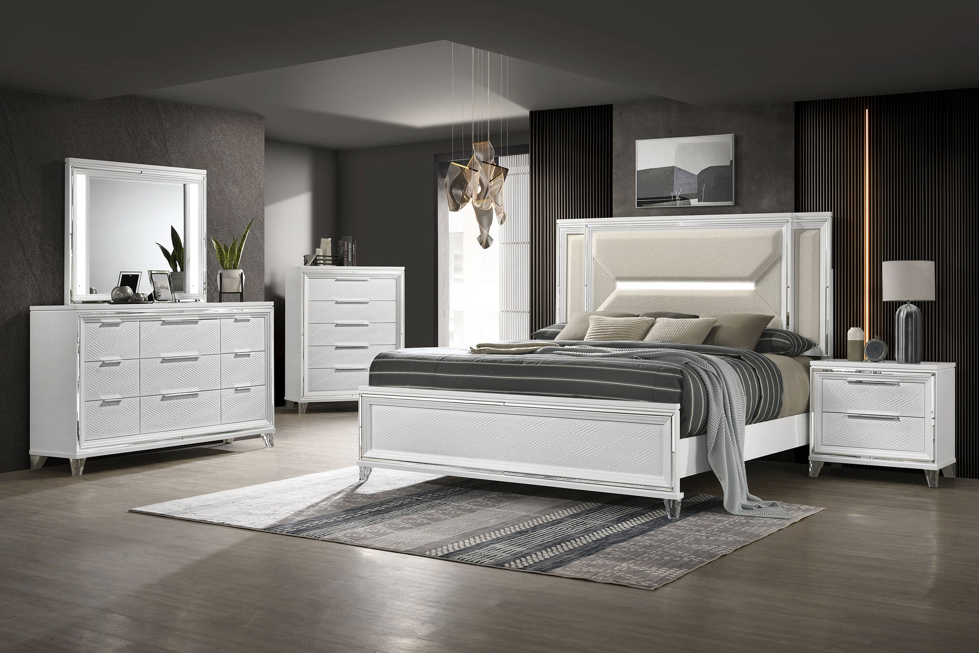 Elevate your bedroom decor with this stunning dresser and mirror set, featuring a modern Italian design with a striking white finish. The dresser offers ample storage with nine drawers, picture framed recessed panels, and embossed herringbone graphic patterns, while the mirror adds a touch of sophistication with its mirror framing and touch LED light. Accented with polished chrome metal hardware and acrylic legs, this set combines style and functionality. Crafted from rubberwood, MDF, and mirror, this dresser and mirror set is a perfect addition to your luxurious bedroom.