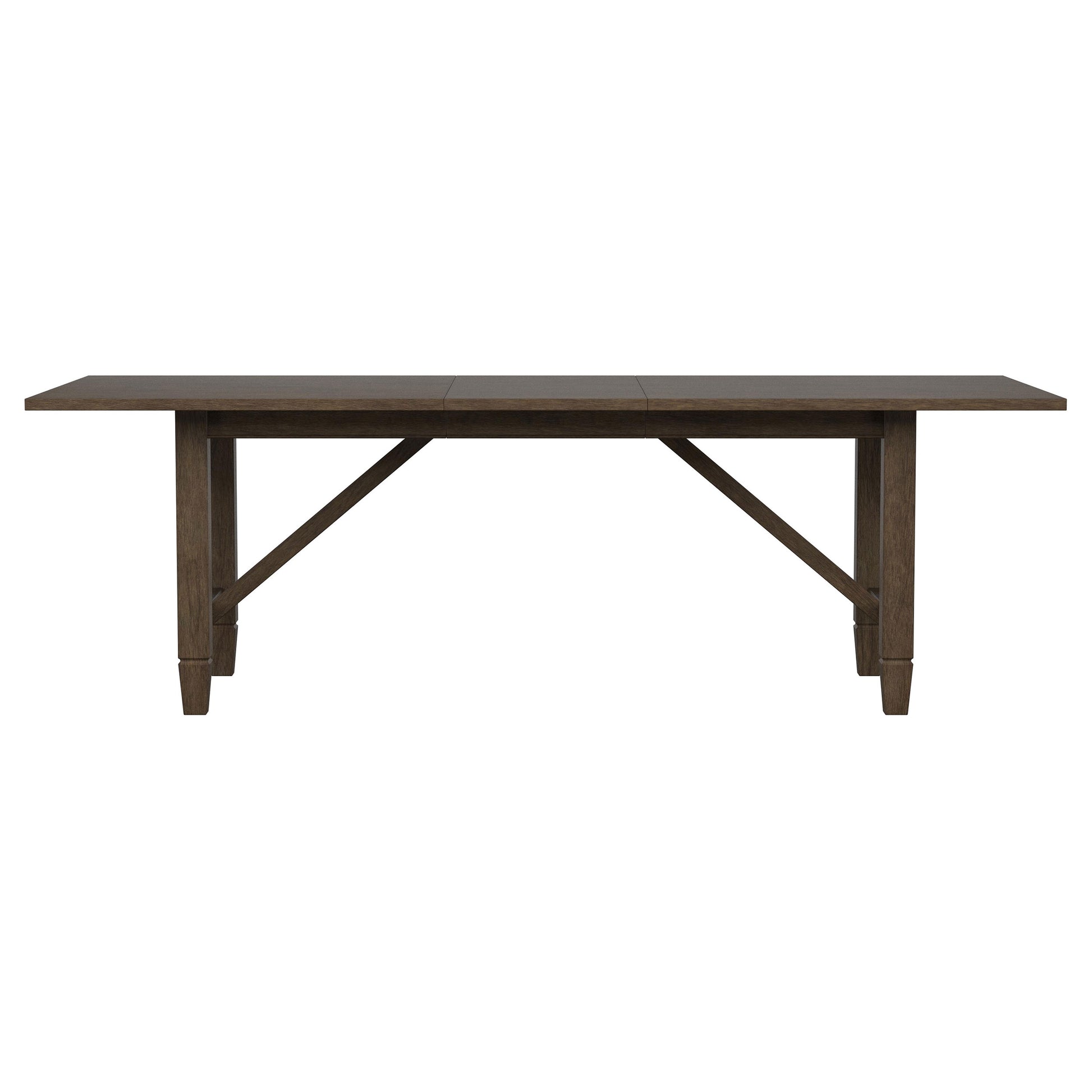 Set the tone in your stylish home with the welcoming ambiance of a modern farmhouse dining table. The rectangular table features a clean, streamlined silhouette complete with a recessed apron and decorative diagonal braces that bring architectural appeal. The table offers a natural wood finish to highlights its beautiful mahogany and rubberwood construction and veneers. The tabletop expands with the addition of the leaf, which measures 18-inches across to add seating for two more of your favorite people. Tapering feet are a subtle finishing touch, defined with linear trim that adds the perfect dose of dimensionality.