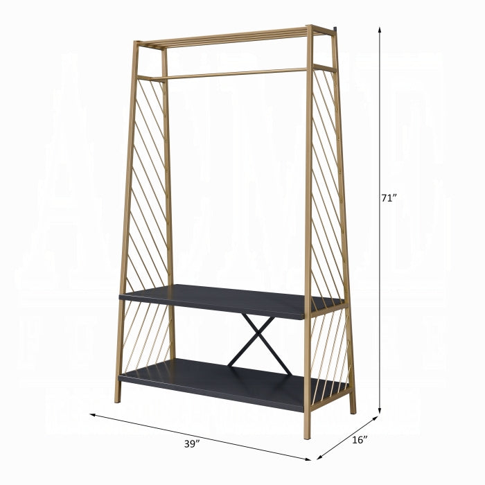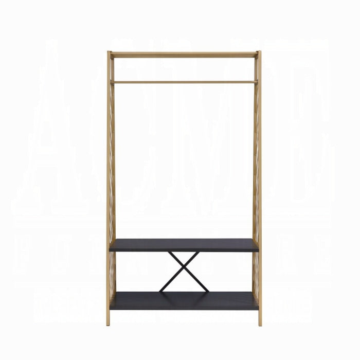 Inspired by contemporary line art, the hall tree showcases a open frame with clean lines that enhances the fashion sense of the space. A gold finish beautifully complements the metal frame while it's shelves in a deep black finish highlight your collections. There are two tier shelves and a hanging rail that allow your to showcase your personal'style.