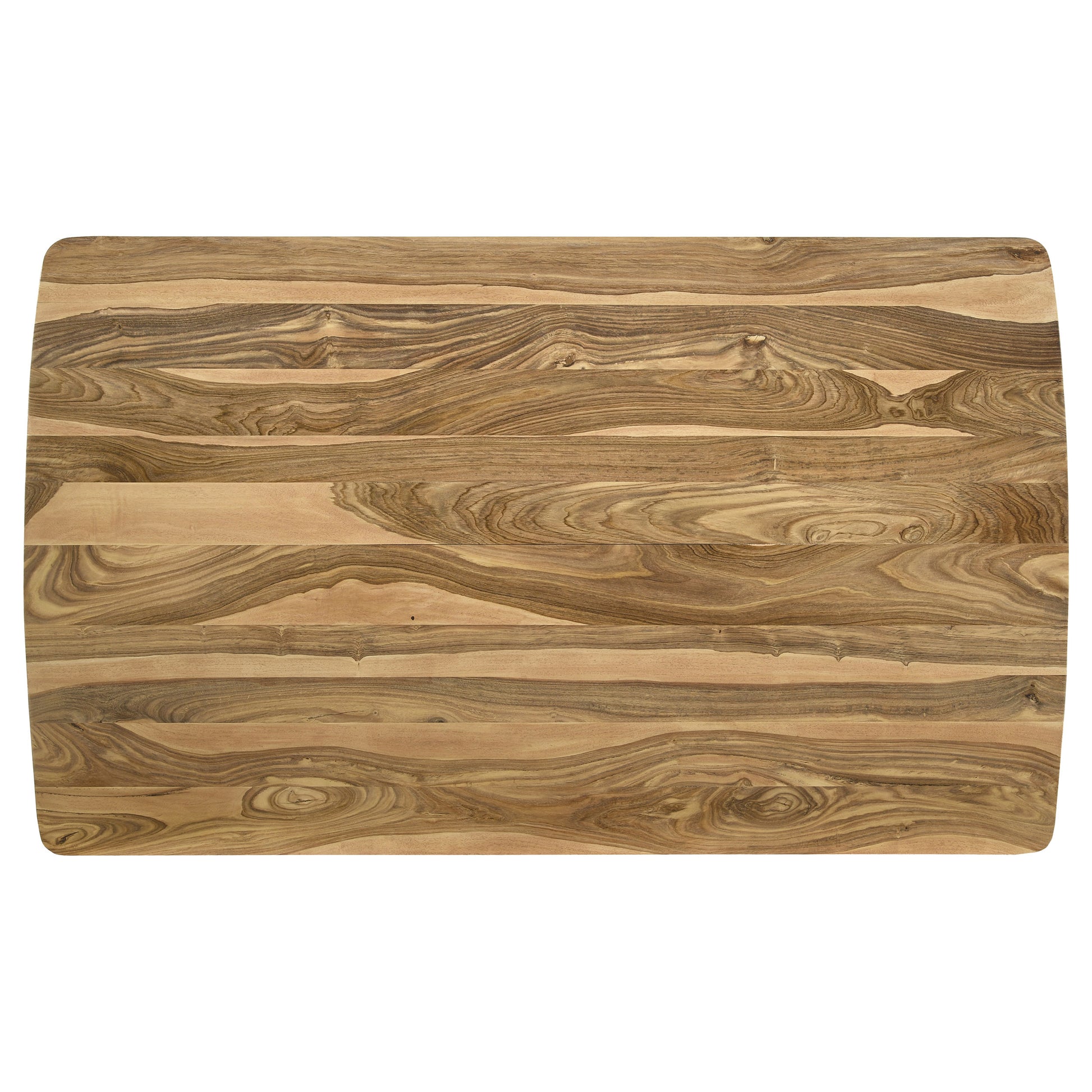 A perfect addition to contemporary homes, this mid-century style counter height table creates a warmth to a dining area with its solid natural Sheesha wood frame. Graceful curved edges and a 45-degree chamfered profile lend a softness and elegance to this furniture piece. Along the apron of this charming contemporary dining piece is an arrow-inspired graphical design in a contrasting black hue that lends a playful touch. Supported by long slender legs that taper toward the feet, this counter height table pushes the vintage vibes. Pull up a counter height stool or chair to seat six family members or guests comfortably.