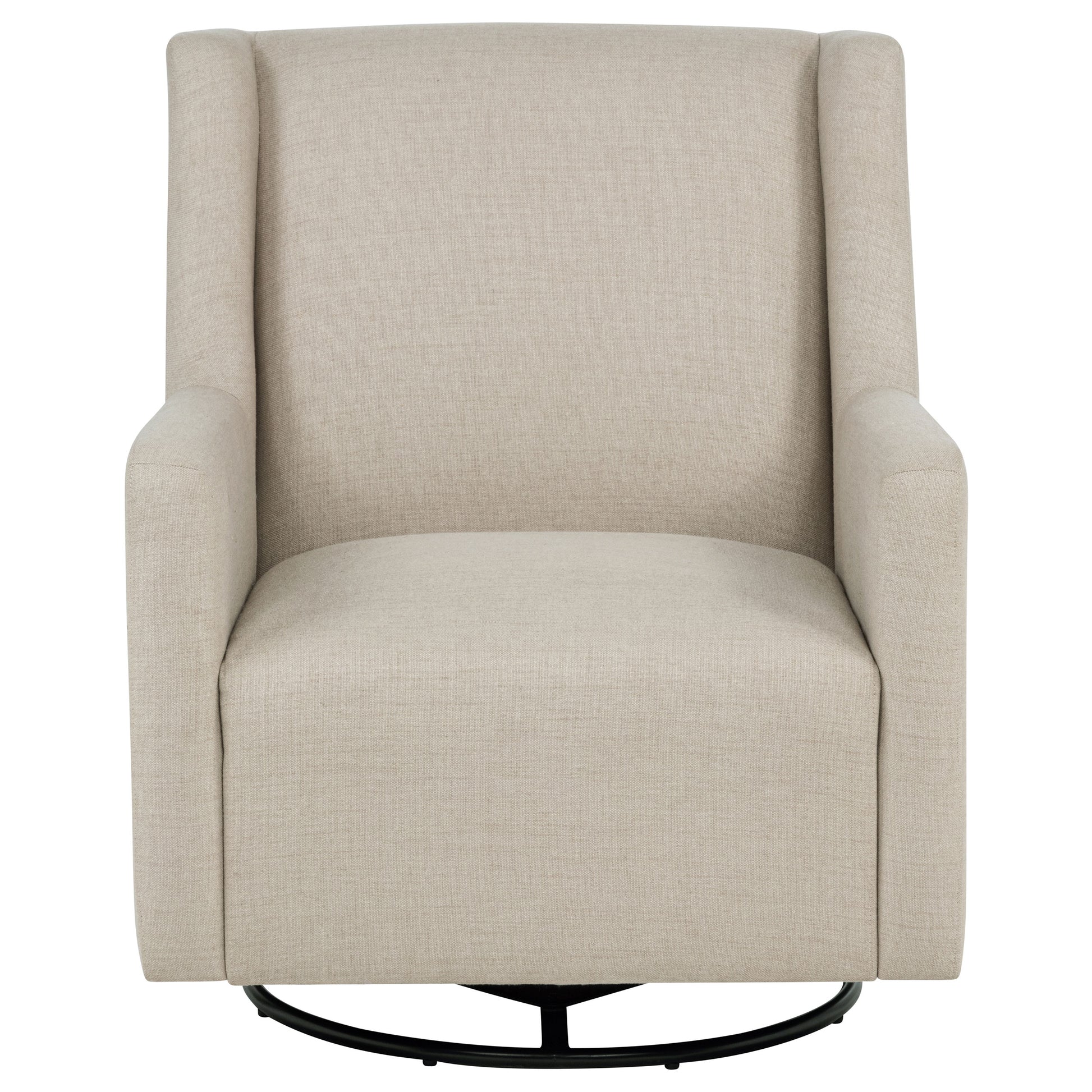 Comfort flows from every angle in this swivel accent chair. With gently sloped arms and a tall, tailored backrest, it wraps the body in a soft, supportive shape. Upholstered in smooth fabric and mounted on a black metal base, it glides with ease to match your movements. Clean edges, plush cushioning, and fluid form blend practicality with understated romance—making it ideal for nurseries, reading nooks, or refined lounge spaces.