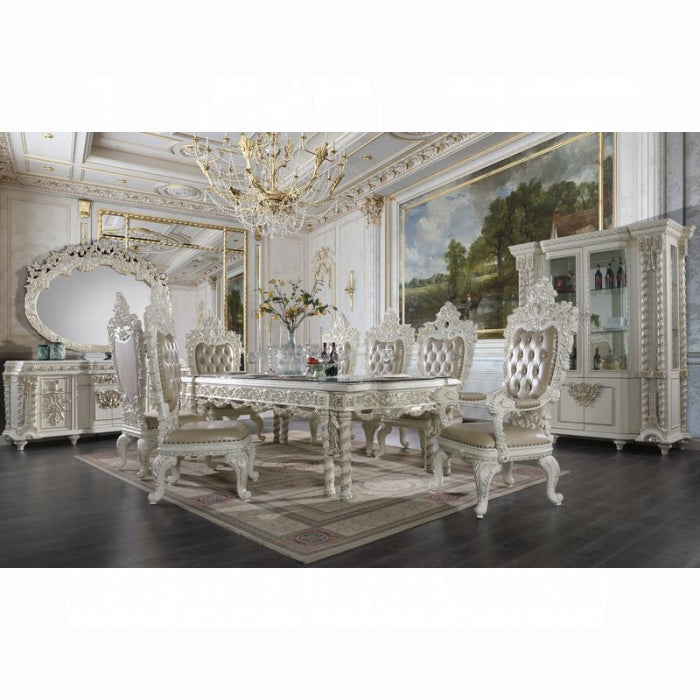 Sophisticated luxury radiates beautifully in the Vanaheim Dining Room Collection. Fabulous floral design with gorgeous details in each piece makes the collection classical and timeless. Antique white finish gives the surface an alluring feel and elegant touch. A clear glass dining table top allows light to filter into and through the whole table, enhancing the collection's overall design. Upholstery side chairs feature elaborate button-tufted design for adding extra style and comfort to the collection. This extremely extravagant style will make any ordinary dining room appear much more unique.