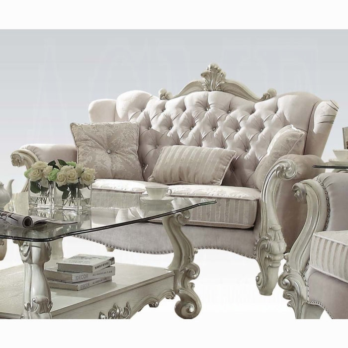The Versailles collection with bone white finish will create you an elegant, warm and traditional taste in your living room. The sofa set reflects highly decorative base with scrolled feet, and the upholstered seats with the deep button tufted and Nailhead trim accents add classic character and represents luxurious detailing. The collection is your perfect choice for your living room.