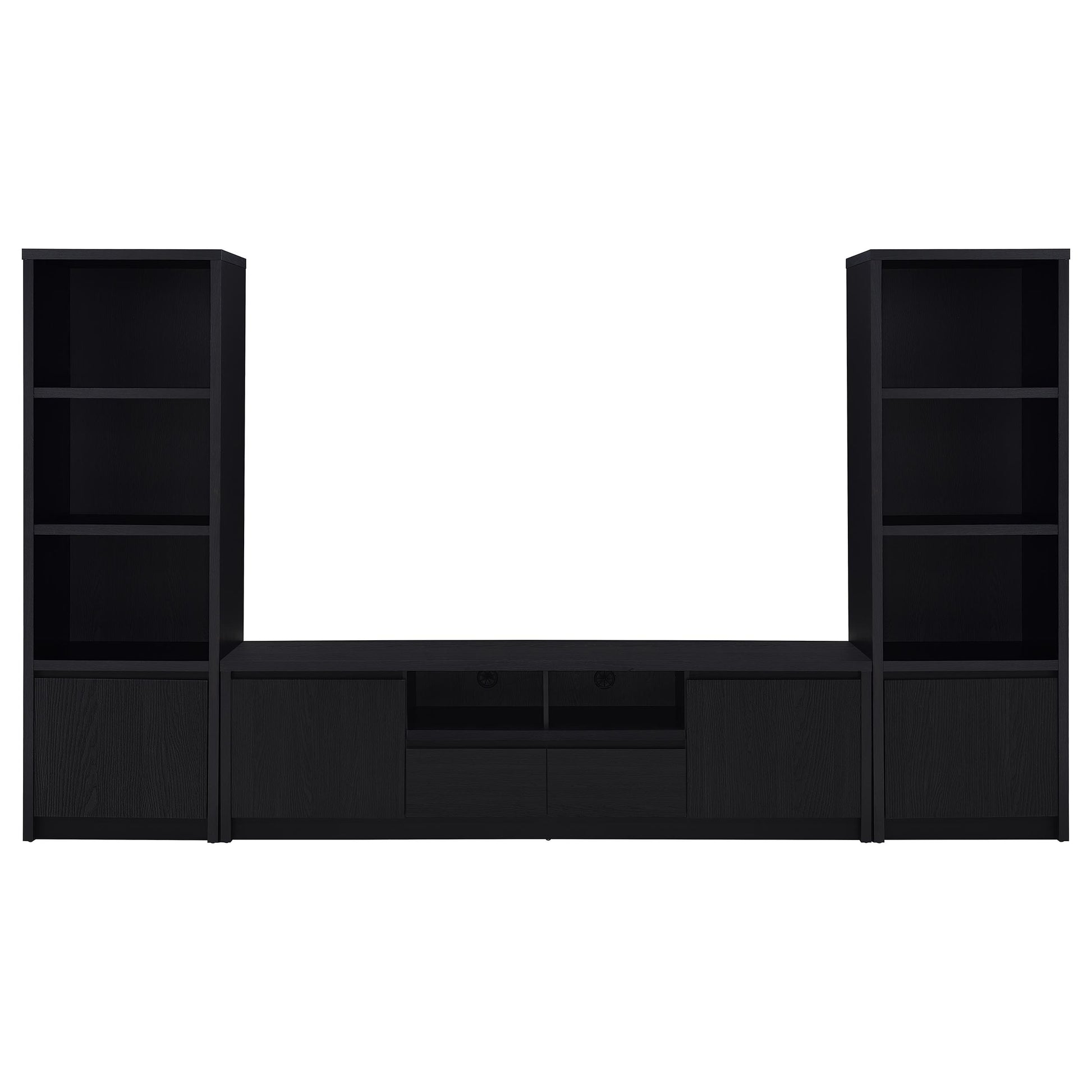 This modern entertainment center combines a sleek TV stand with two matching media towers, offering style and functionality. Finished in a bold black with a scratch-resistant eco-friendly laminate veneer, this unit provides ample storage and display options. The TV stand features cabinets, an open shelf with cable management, and a wide drawer, while each media tower includes open shelves and a bottom cabinet for organized storage. Perfect for creating a cohesive entertainment space in any living room.