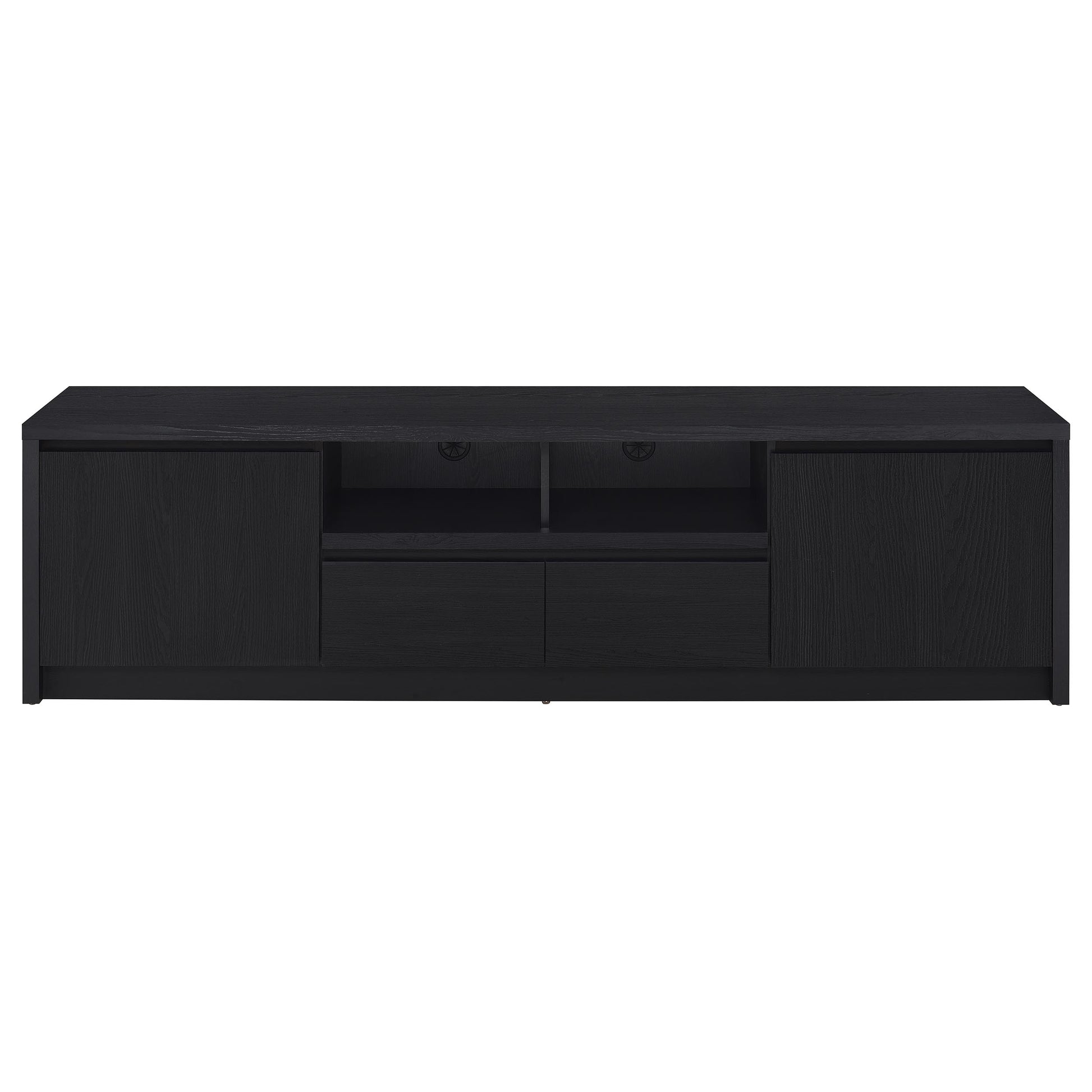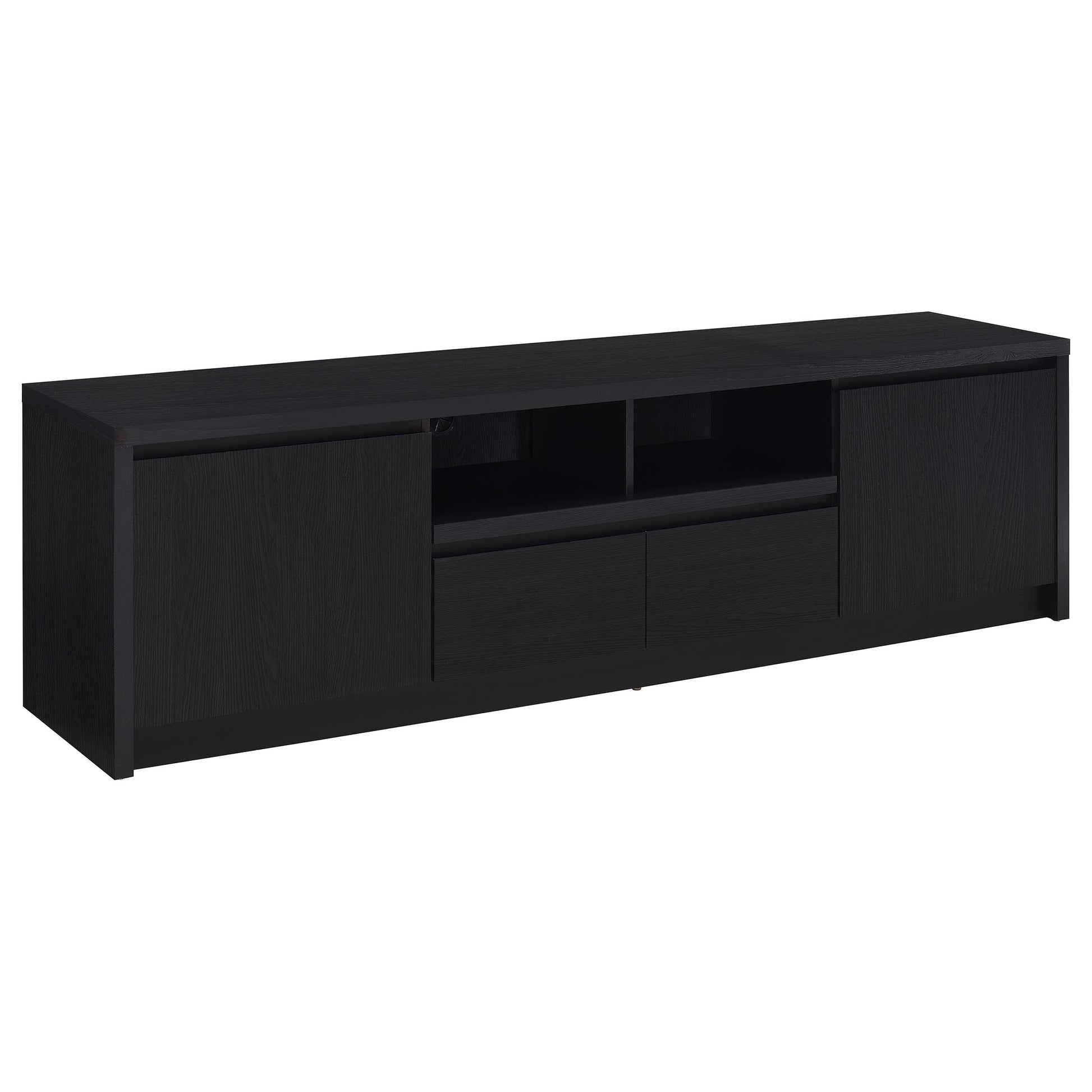 • TV stand includes two spacious cabinets, an open shelf with cable management, and a wide drawer